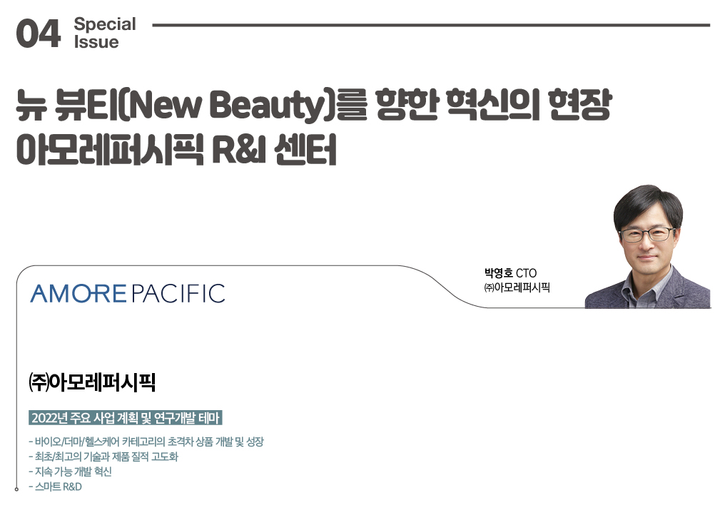 디지털 기술의 발전은 개인화된 뷰티 솔루션 개발을 가속화하고 있습니다. 비대면 피부진단, 맞춤 구독 서비스, 가상(Virtual) 뷰티의 확대가 바로 그것입니다. 자사는 바이오/디지털 융합 기술 기반의 새로운 진단 서비스를 확대하고 이를 기반한 새로운 맞춤형 화장품을 개발하여 새로운 고객 경험을 제공하고자 합니다. 이러한 연구의 결과로 맞춤형 마인드 링크드 배스봇과 맞춤 스킨케어 플랫폼 기술이 2022 CES 혁신상을 수상하는 쾌거를 이루기도 했습니다. 아모레퍼시픽 연구소는 디지털 기술을 접목한 새로운 뷰티 솔루션을 개척하고 초개인화솔루션 개발을 위한 도전에 앞장서고자 합니다.