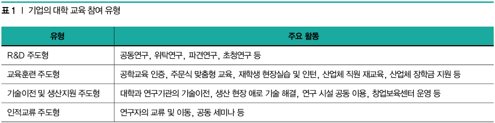 기업이 대학교육에 참여하는 사례는 흔하지는 않은 것으로 보인다. 두 가지 사례는 대기업인 삼성디스플레이와 중소기업인 엑시콘의 사례이다. 삼성디스플레이는 제조설비를 유지보수하는 엔지니어의 기술역량이 중요하여 인력양성을 추진하였고, 전문적이고 다양한 강사진을 확보하여 이론과 실습을 병행하는 교육 커리큘럼을 구성하고 운영하였다. 엑시콘은 반도체 장비 개발 등을 담당하는 중소기업으로 2008년 고용유지 훈련을 통해 회사의 위기를 극복하기도 하였다. 엑시콘은 과거에는 기술 중심의 교육 프로그램 중심으로 대학교육에 참여 하였지만 최근에는 기술부분을 포함하여 특허, 품질, 리더십 등 다양한 분야의 교육 프로그램에 참여하여 교육훈련에 필요한 비용을 지원받을 수 있는 장점을 활용하였다.