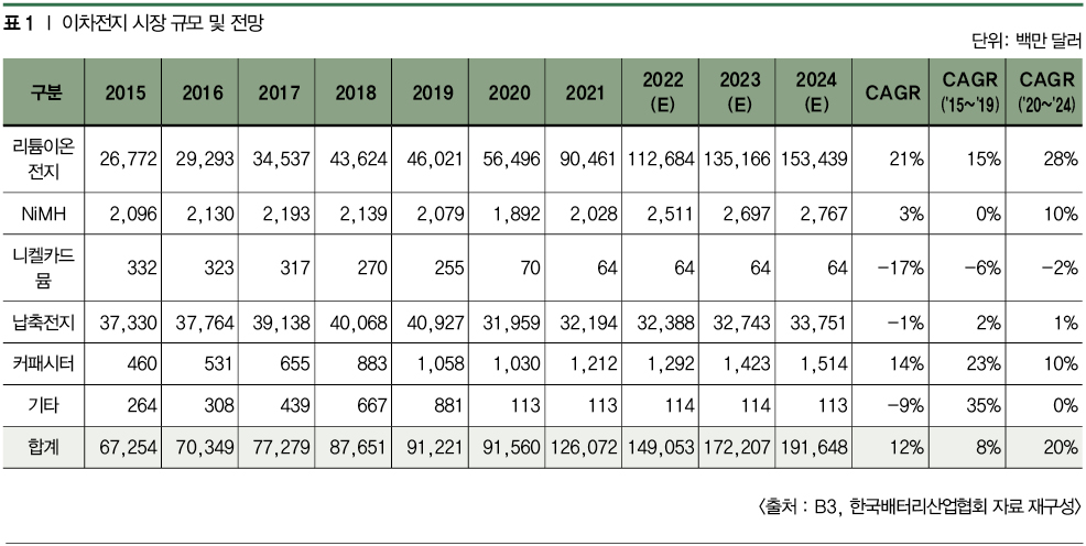 차세대 이차전지라는 용어는 계속 사용되어 왔다. 납축전지가 주로 사용될 때는 니켈카드뮴·니켈수소전지가, 니켈카드뮴·니켈수소전지가 사용될 때는 리튬이온전지가 차세대 이차전지였다. 응용처의 특성, 소비자의 기대치 등에 의해 새로운 이차전지의 필요성이 대두되고, 이에 대응할 수 있는 차세대 이차전지에 관한 연구·개발이 진행되는 것이다. 새로운 이차전지는 기존 이차전지 시장을 대체한다기보다는, 새로운 시장을 개척하면서 이차전지 시장을 팽창시키며 성장한다고 할 수 있을 것이다.