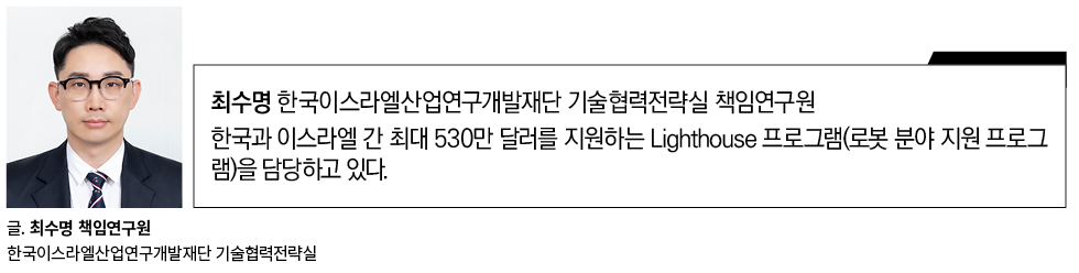 2019년 한국의 산업통상자원부와 이스라엘 경제산업부는 루벤 리블린 이스라엘 대통령 방한을 계기로 첫 번째 전략 투자 분야로 로봇산업 분야(물류, 서비스, 농산업 등)를 선정하였다. 한국이스라엘 산업연구개발재단을 통해 로봇 분야 기술협력 프로그램인 “라이트하우스 프로그램(Lighthouse Program)”을 론칭하기로 합의했다. 당시 과제당 최대 지원금을 400만 달러(약 47억 원) 규모로 합의하였으나 현재는 530만 달러(약 62억 원)로 증강하였으며 내년에 론칭 예정이다.