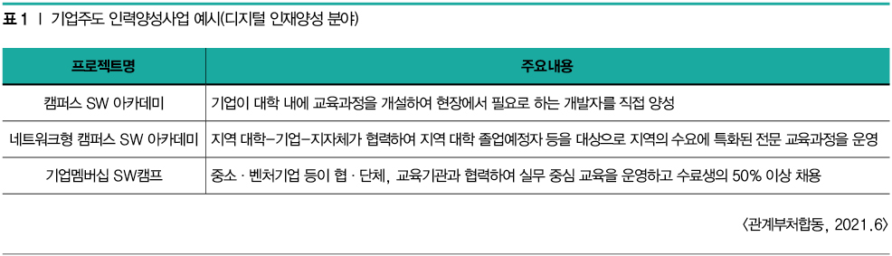 마지막으로 기업 훈련센터등을 활용한 직접 인력양성이다. 삼성SW아카데미, SK반도체스쿨, 우아한테크코스 등 기업 맞춤형 인력양성과 사회공헌관점에서 수준별 기술인력을 양성하고 있다. 최근에는 일부 프로그램이 정부주도 인력양성사업에 편입되어 그 영향력이 확대되고 있다.