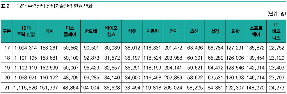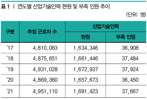 매년 산업통상자원부와 한국산업기술진흥원에서는 산업기술인력에 대한 현황 파악을 위해 산업기술인력 수급 실태조사를 실시하여 그 결과를 발표하고 있다. ’21년 기준 반도체, 디스플레이, 자동차, 철강 등 10인 이상 제조업 및 제조업 기반 서비스업의 근로자 수는 전년대비 1.7% 늘어난 4,951,110명으로 이 중 산업기술인력은 1,681,423명으로 나타났다. 부족인원은 37,667명으로 전년대비 3.3% 증가하였다.
