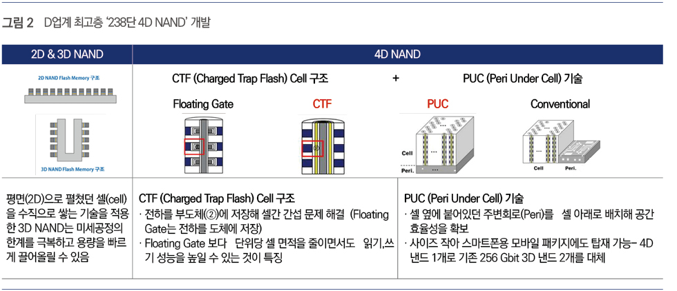 또한 SK하이닉스는 업계 최고층 176단 4D NAND를 개발하였는데, 4D NAND의 개척자로서 업계 최고의 생산성과 기술력으로 집적도 향상과 생산성 극대화를 동시에 달성하기 위해 NAND 플래시 시장을 선도하고 있다.