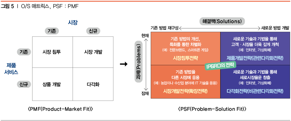 신제품 개발은 시장에 존재하는 제품이나 기술이 아니라 새로운(New to Market) 제품/기술을 목표로 한다. 앤소프 매트릭스는 기존시장과 신시장, 기존제품과 신제품의 매트릭스이다. 이를 PMF(Product Market Fit)라고 부른다. IP-R&D 전략의 목적/수단 매트릭스(O/S, Object/Solution, P/S, Problem/Solution)는 PSF(Problem Solution Fit)라고 부른다. 이를 합치면 블루오션과 레드오션을 찾아낼 수 있다.