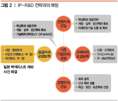 IP-R&D 전략은 전세계 특허 빅데이터(5.4억건)를 분석하여 경쟁사의 핵심특허에 대해서는 대응전략을 세우고, 대학이나 출연연이 가진 핵심특허는 사오고, 공백기술은 신규특허로 창출하는 전략이다.