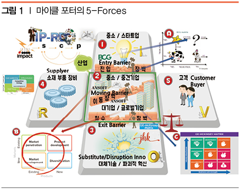산업구조 분석은 마이클 포터의 5-Forces와 가치사슬(Value Chain)로 가능한 데 IP-R&D는 5-Forces에 맞는 5가지 모듈을 가지고 있다. 예를 들면 소부장은 공급자의 교섭능력과 관련 있으며 수입선 다변화나 국산화 이슈를 해결한다.
