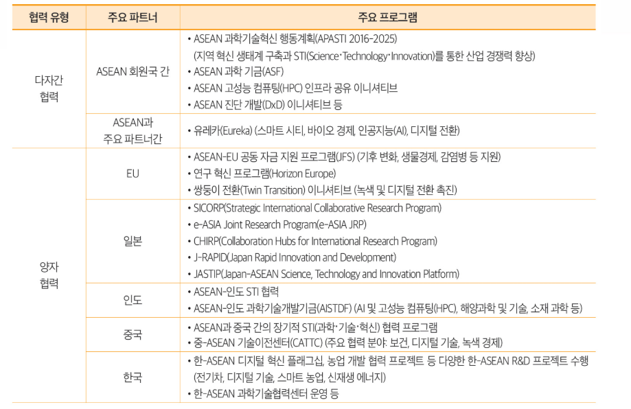 특히 ASEAN은 EU나 일본, 중국, 인도와 같은 나라들과 기술 이전 및 혁신 성과를 향상하는 프로젝트를 촉진하기 위해, 다양한 협력 채널을 개발하여 진행해 오고 있다. 한국과는 1989년 ASEAN과 대화 관계(Dialogue Partnership)를 수립한 이후 다양한 STI 협력을 추진해 오고 있다.