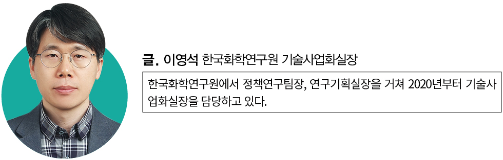 기술이 제품이나 서비스로 사업화되기 위해서는 길고 험난한 여정을 거치며 다양한 불확실성을 극복해 나가야 한다. 이 과정에서 출연(연) 기술사업화 전담조직이 보다 많은 기회와 가치를 창출하기 위해서는, 마케팅과 기술이전을 넘어 특허 창출 및 기술이전 이후의 기업지원까지 전체적인 가치사슬로 업무범위와 역량을 확장해 나가는 것이 중요하다. 화학(연)은 이를 위해 2020년 기술사업화 업무혁신을 위한 종합계획인 「KRICT IP경영 및 기술확산 기본계획」을 수립하여 추진하고 있다.