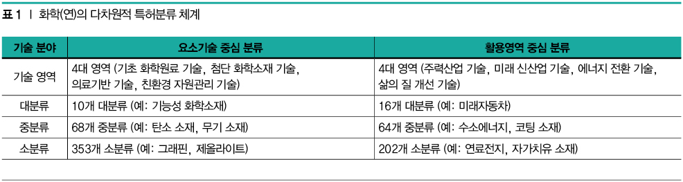 이와 함께 화학(연)은 연구원이 보유한 특허에 대한 기업의 수요기술 탐색과 접근성을 높이기 위해 두 가지의 특허분류체계를 운영하고 있다. 하나는 많이 활용되는 요소기술 중심의 특허분류로 실제 화학(연)이 보유하고 있거나 보유할 수 있는 특허분야를 그룹핑하여 분류체계를 설정하였다. 다른 하나인 활용영역 중심 특허분류는 특허가 실제 활용될 수 있는 시장, 제품, 및 용도를 중심으로 구성되어 있다. 요소기술 중심 특허분류체계에서는 한 특허가 한 가지 분류에만 매칭되지만, 활용영역 중심 특허분류체계에서는 동일한 특허가 다양한 영역이나 제품에서 다양한 용도로 활용될 수 있기 때문에 한 특허가 복수의 분류체계에 중복 매칭될 수 있다.