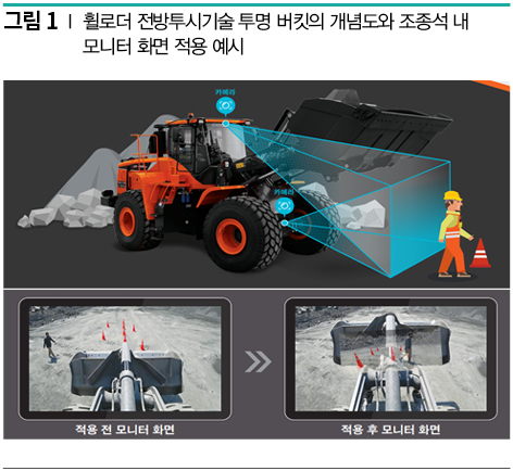 투명 버킷의 정식 기술 명칭은‘건설장비 전방투시기술’이다. 버킷에 의해 시야가 가려지지만 전방 시야를 운전자에게 확보해주는 기술이다. 본 기술은 회사 내부의 NTD(New Technology Development) 프로세스를 통해 인큐베이션 되던 기술이었는데 CES 소비자 가전 전시회에 참가하게 되면서 NTD에서 NPD(New Product Development) 프로세스로 직행하게 된 경우다.