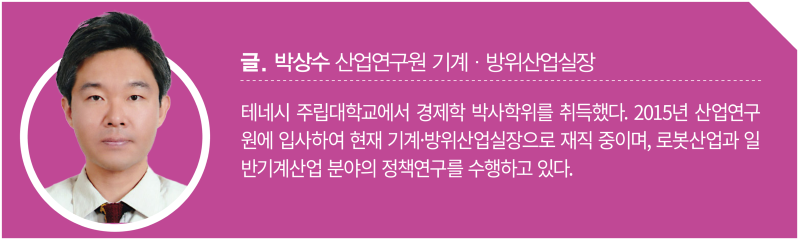 우선, 중국과의 로봇 기술격차를 유지하기 위해서는 로봇 핵심부품의 경쟁력을 확보해야 한다. 이를 위해서는 산업용 로봇의 대규모 수요를 담당하는 대기업과 부품·완제품 생산기업이 생산공정 현장에서 함께 개발 제품의 성능과 품질을 직접 평가하고 검증해야 한다. 이로써 수요처의 요구를 충족시키는 신뢰성 높은 제품이 조기에 시장에 출시되고, 이것이 양산 체제로도 이어질 것이다. 한국 로봇 산업의 경쟁우위 확보를 위해서는 이러한 실증 및 보급 사업의 확대가 필요하다.