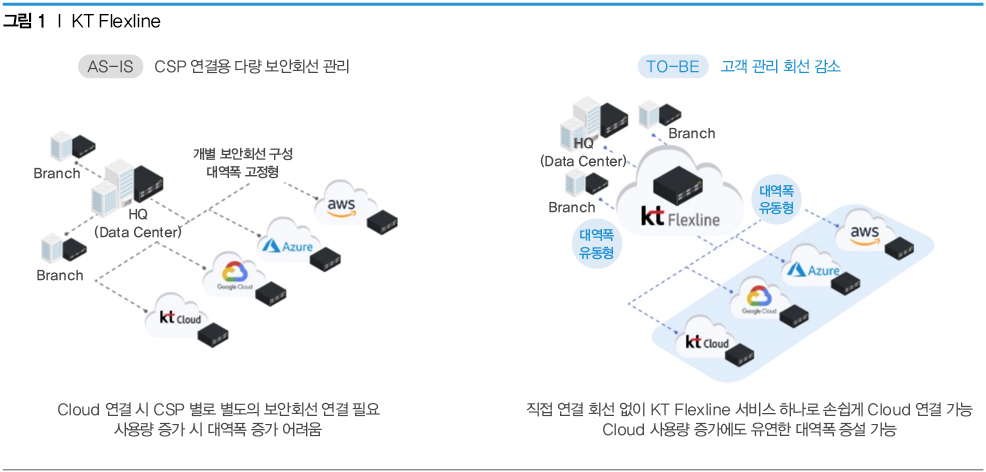 엔터프라이즈 고객을 위한 KT의 DX 서비스로는 Flexline과 양방향 문자, AICC 서비스 등이 있다. Flexline은 클라우드 환경에 최적화된 새로운 회선 서비스로 SDN을 제공해 고객의 트래픽을 유연하게 관리하며, 빠르고 안정적인 클라우드 연결을 지원한다. 양방향 문자는 유선 번호를 통한 SMS/LMS 서비스로 브랜드 이미지 통합과 개인정보 보호에 기여한다. AICC는 컨택센터와 콜센터의 업무를 디지털화하여 고객 응대 효율을 높이고, 비용을 절감하는 서비스다.