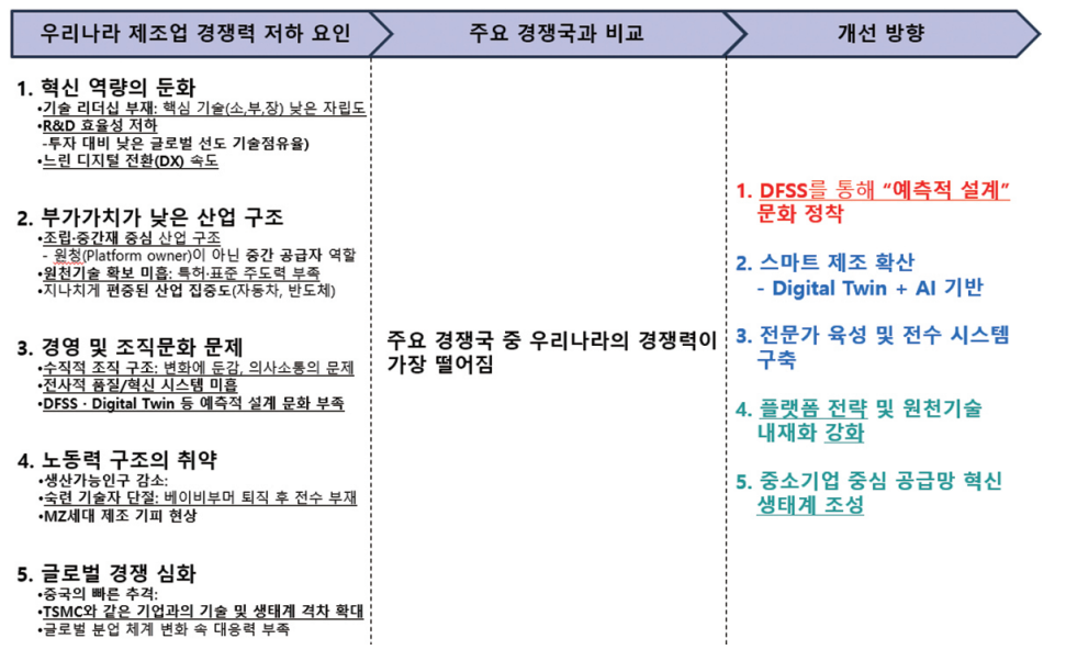 DFSS를 통해 일련의 기능이 유기적으로 연계될 경우, 이를 기반으로 Digital Twin과 연계하여 예측 경영을 강화할 수 있으며 나아가 플랫폼 구축 및 생태계의 기반을 조성할 수 있다. 우리나라 자동차의 신뢰성이 산업 평균에 미치지 못하고, 최근 반도체가 고전하는 것 모두 설계와 관련이 있다고 할 수 있다. 왜냐하면 제품이 고급화 및 미세화가 진전됨에 따라 고정밀 및 높은 정확도를 갖는 설계가 요구되나 기존의 “반응적 설계” 방식으로는 이에 대응할 수 없기 때문이다. 따라서 우리나라가 중저가 자동차나 10nm 이상의 레거시 노드에 해당되는 반도체만을 판매할 것이 아니라면 3세대 품질인 “예측적 설계”로 전환해야 한다.