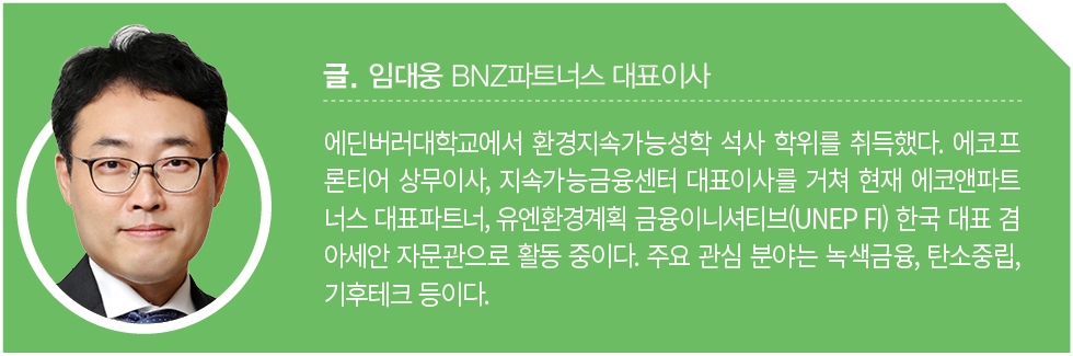 이 과정에서 ‘녹색금융’이라는 것이 등장했다. 우리나라는 지난 3월 19일 금융위원회가 ‘기후위기 대응을 위한 금융지원 확대방안’을 발표하면서 녹색금융의 전 세계적 흐름에 동참하게 되었다. 이 내용에 따르면 2050년 탄소중립 달성을 위해서는 저탄소 공정 전환, 재생에너지 확대, 기후 신산업 지원의 조치가 필요하다. 이를 위해 정부는 (1) 2030년까지 녹색자금 420조 원 공급, (2) 미래에너지펀드 9조 원 조성, (3) 기후기술펀드 3조 원 등 9조원 규모의 펀드를 조성할 계획이다. 정부는 2024년 48.6조 원에서 2030년 74.4조 원까지 단계별로 녹색자금 공급량을 늘려나갈 계획이다.