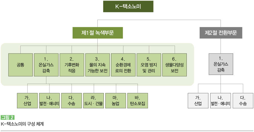 K-택소노미는 기후변화 완화와 적응, 물, 순환 경제, 오염 방지, 생물다양성의 6대 환경목표를 가지고 있다. 이 중 하나 이상의 목표에 기여해야 하며(활동기준, 인정기준), 그 과정에서 나머지 환경목표에 심각한 환경피해를 입히지 않아야 한다(배제기준). 또한 인권, 안전, 뇌물 등 최소한의 사회적 기준(보호기준)을 모두 충족할 때, 택소노미에 적합한 녹색 경제활동으로 판단된다. K-택소노미는 녹색부문과 한시적인 녹색으로 간주하는 전환부문으로 구성되어 있다. 녹색부문은 공통 활동과 6대 환경목표로 구성되어 있고, 전환부문은 온실가스 감축 관련 1개의 환경목표로 구성되어 있다.