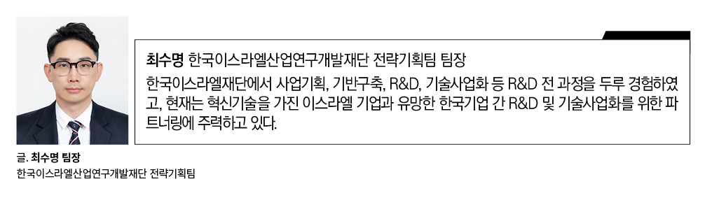 이스라엘은 원천기술 강국다운 물리학, 공학, 데이터, 인공지능 등 다양한 공학 및 응용과학 분야에서 세계적인 기술력을 확보하고 있으며, 이는 바이오융합 분야의 리더가 될 수 있는 중추적인 성장 동력이 될 것이다. 또한, 이스라엘의 강점 중 하나인 정부 차원의 R&D 프로그램을 활용하여 우수한 다학제간 역량을 갖춘 국가와의 글로벌 협업을 추진하는 것이 글로벌 경쟁력을 갖추기 위한 핵심 전략이 될 것이다.