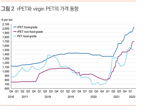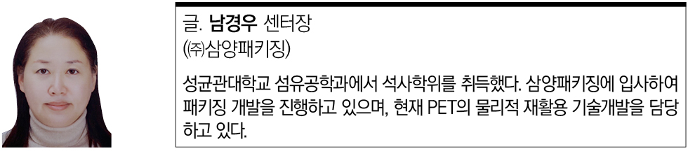 각국의 포장재 폐기물에 대한 친환경 정책은 코로나 팬덤 상황에도 불구하고 지속해서 확대되고 있다. 특히 EU 시장은 2030년까지 모든 플라스틱 포장재를 재사용이 용이하거나 재활용 원료 사용을 의무화하였다. 이에 글로벌 기업에서는 빠른 대응책 발표와 재생원료 확대를 선언하고 있다. 안정적인 재생원료의 생산량과 물성을 확보한 rPET를 제조하기 위해서는 폐 PET 용기 수집의 고리가 형성되어야 한다. 국내는 PET 용기 재활용률이 80% 이상으로 높으나 고품질 제조 기술 미확보 및 rPET 공급 부족과 수요 증가로 인하여 향후 국내에서 rPET를 사용하기 위해서는 높은 가격을 지불해야 할 것으로 예상된다.