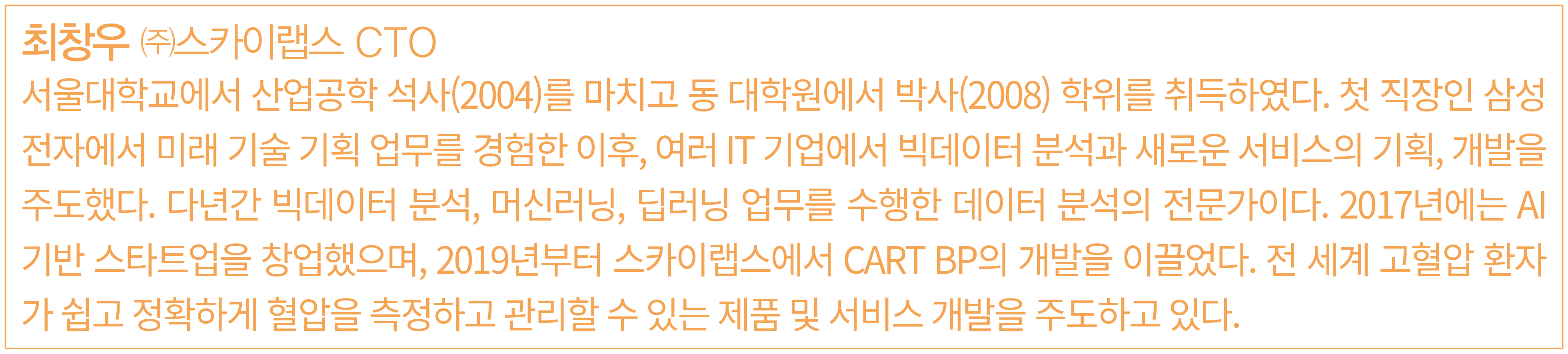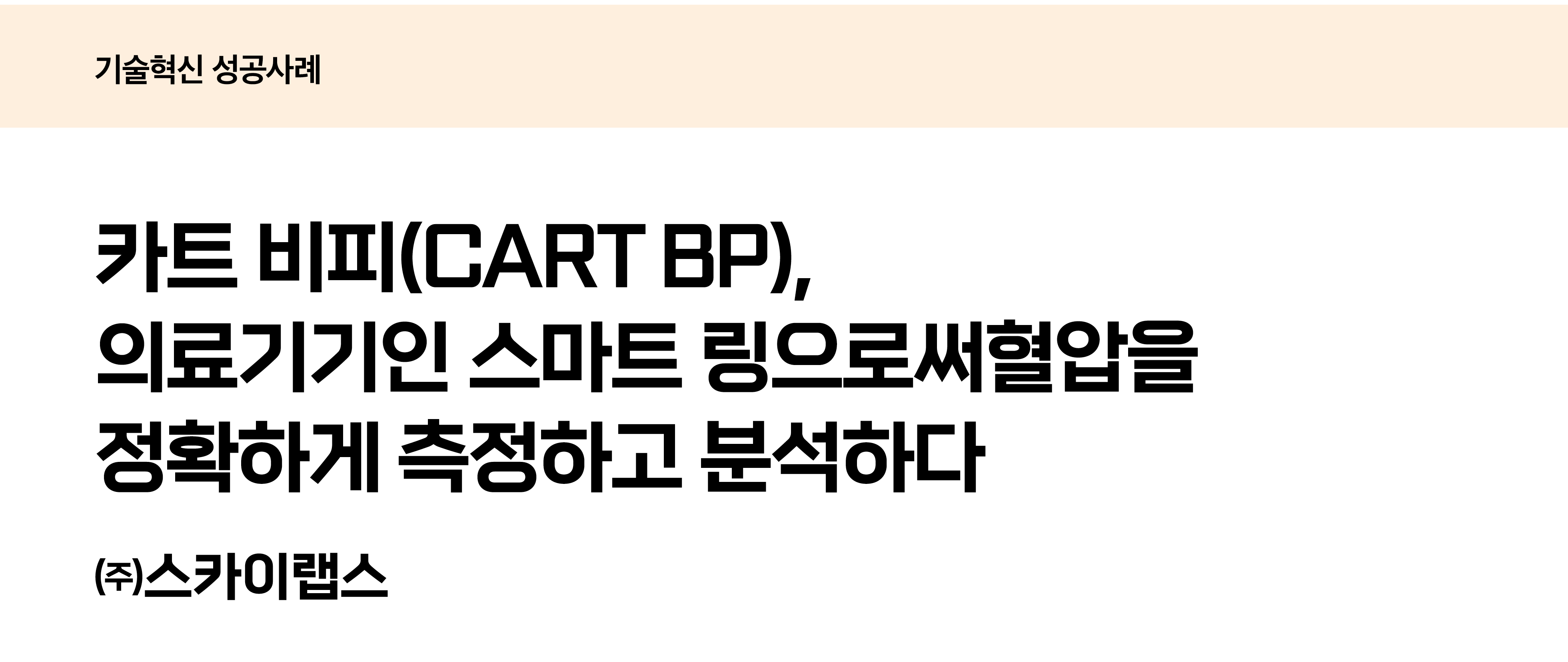 일상생활은 물론 수면 중에도 건강 상태를 지속적으로 모니터링할 수 있는 스마트 링이 의료 현장에 도입되었다. ㈜스카이랩스(이하 스카이랩스)의 ‘카트 비피(CART BP)’는 혈압 변화를 측정하고 분석할 수 있는 의료용 반지로, 의사들이 환자의 혈압 정보를 확인하여 진단과 처치에 즉시 활용할 수 있는 혈압 측정시스템이다. 이번 호에서는 혁신 기술에 기반한 ‘창업의 교과서’와 같은 스카이랩스의 사례를 소개한다.