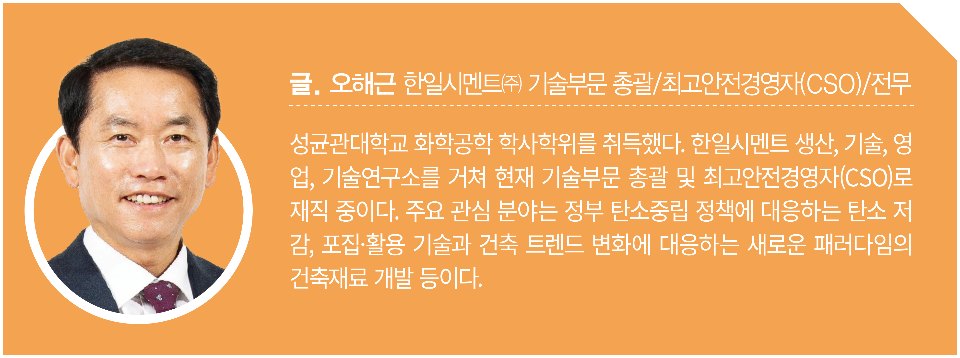 한일시멘트는 시멘트의 주원료이자 소성 과정에서 탄소를 다량 배출하는 석회석의 사용량을 저감하기 위해, 다양한 비탄산염 산업 부산물을 대체 원료로 개발하여 실제 공정에 적용 중이다. 또한 혼합재 사용증대를 위해 고성능 클링커 기술을 개발하고, 클링커 대체를 위해 석회석 혼합시멘트를 개발하는 등 정부 지원 탄소중립 연구 사업에 적극적으로 참여하고 있다. 이외에도 온실가스 감축을 위한 주요 수단으로 각광받고 있는 CCU(Carbon Capture Utilization)를 바탕으로 한 광물 탄산화 기술을 개발하고 있다.