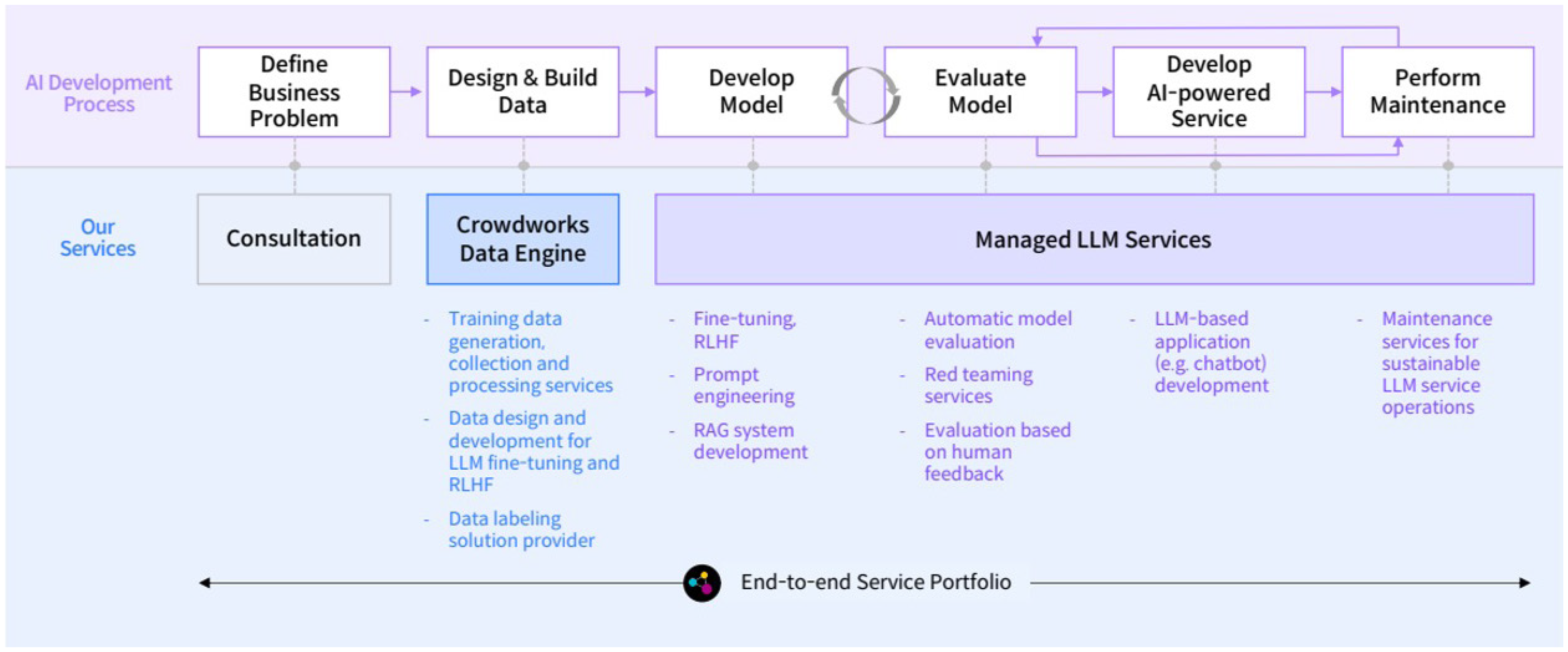 크라우드웍스는 AI 데이터 구축의 전 과정을 노코드로 처리할 수 있는 플랫폼을 자체 개발하여 보유하고 있다. 크라우드웍스의 ‘Workstage’ 플랫폼에서는 데이터 업로드, 작업자 할당, 데이터 가공 및 작업, 검수, 작업 진척률 모니터링 등의 전 과정을 효과적으로 관리할 수 있다. 또한 크라우드웍스는 자체 SLM(Small Language Model) 및 언어모델 프레임워크를 개발하여 제공하고 있다. 이는 고객사의 AI 모델 개발·활용 목표와 성능 요구사항에 맞출 수 있도록 다양한 언어모델의 성능을 비교할 수 있고, Customization 및 모델 튜닝이 가능하다는 장점이 있다.