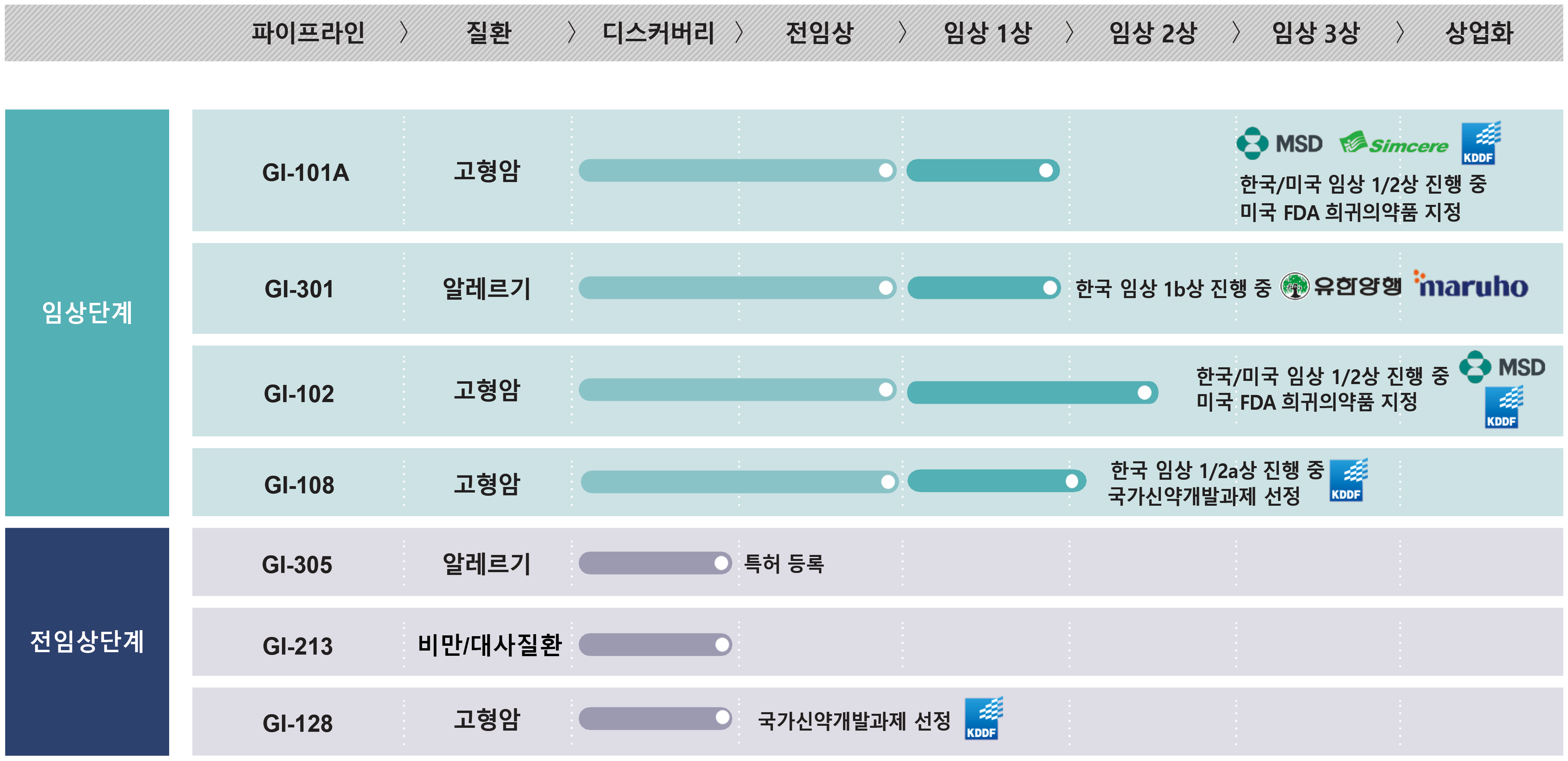현재 지아이이노베이션은 △면역항암제 GI-101A/GI-102 △알레르기 치료제 GI-301 △대사 면역항암제 GI-108의 임상 단계에 진입해 있다. 그 밖에 다양한 전임상 파이프라인들의 연구개발도 빠른 속도로 진행 중이다.