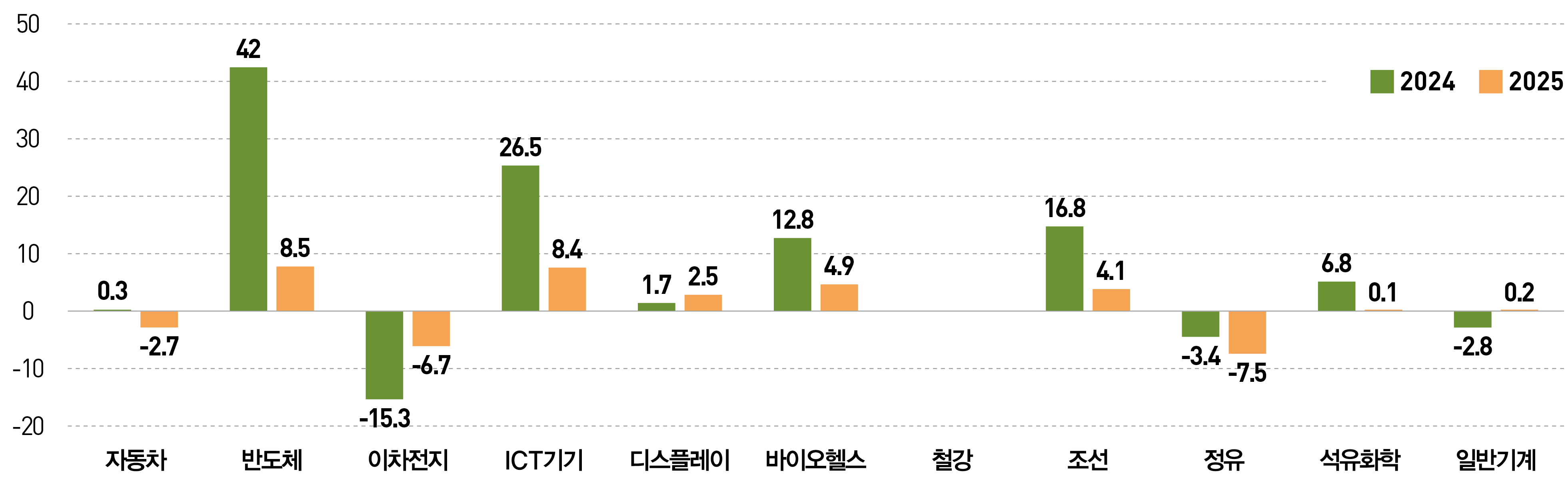 [그림1] 2025년 주요 산업의 수출 증감률 전망 (단위: %)