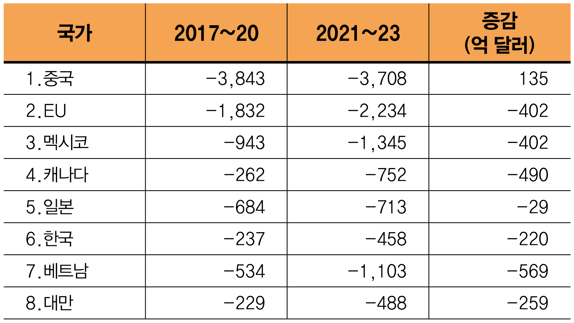 미국의 무역수지 적자 문제에서 우리나라가 사정권 안에 있는 것은 분명하다. 하지만 우리나라가 첫 번째 표적은 아닐 것이다. 미국의 적자는 중국을 제외하고도 EU, 캐나다, 멕시코, 일본, 베트남과의 무역에서 우리나라보다 더욱 크고 빠르게 증가했기 때문이다. 우리나라의 대미 수출액이 큰 자동차의 경우, 무역수지 측면의 대응과 더불어 트럼프 1기에 경험한 통상법 232조의 적용 가능성에 대해서도 대비해야 한다. 보편 관세의 경우, 이것이 현재 미국 경제의 약한 고리인 물가를 자극할 수 있어 시행되더라도 속도 조절이 더해질 것으로 보인다. 우리가 과거의 경험을 복기하고 다른 나라의 협상 과정을 참고하여, 효과적인 대응 방안을 마련할 시간과 기회는 충분하다.