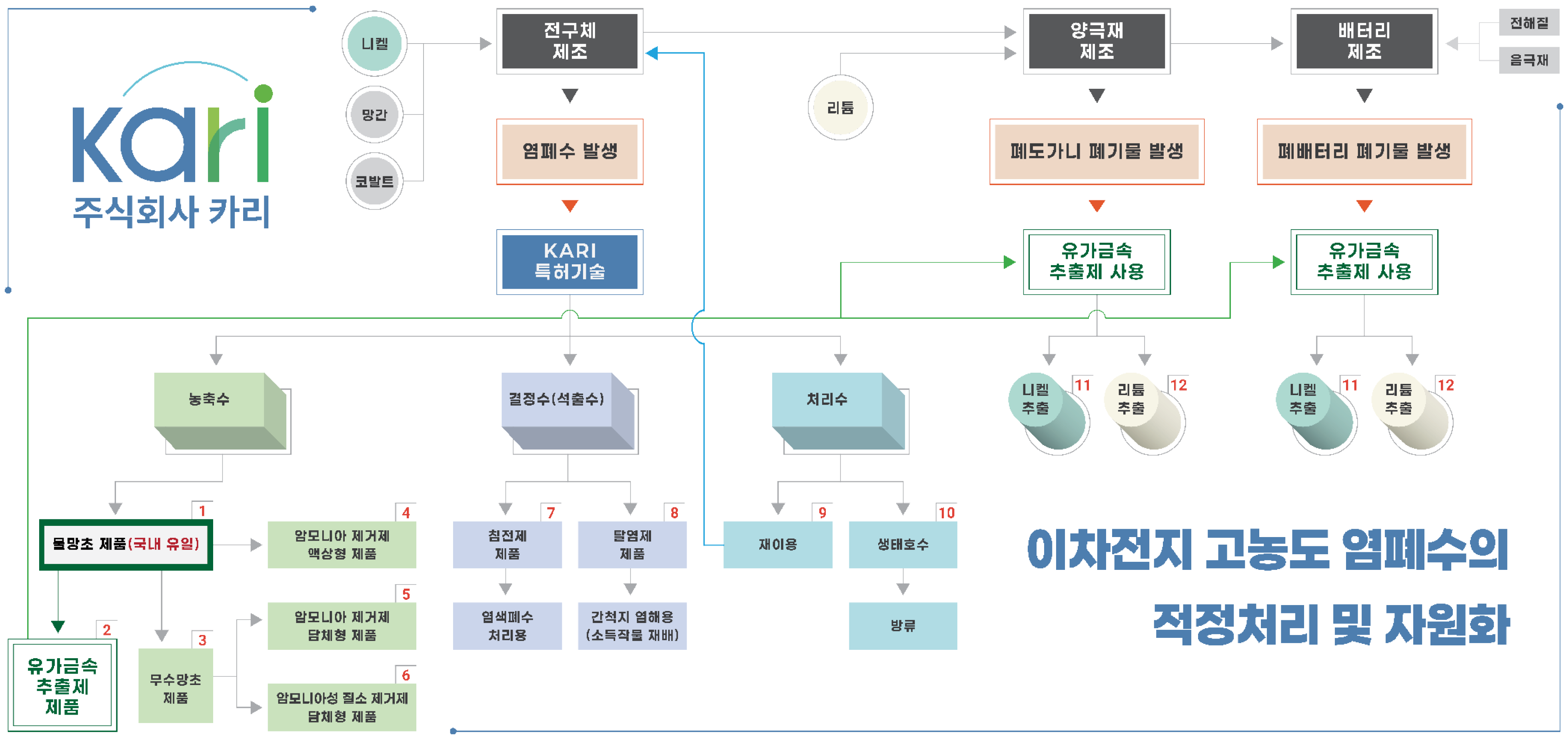 이러한 문제를 극복하기 위해 한국의 기업 카리(KARI; Korea Aqua Resource Innovation)는 자체 개발한 염·폐수 처리 및 부산물 자원화 특허 기술을 상용화하고 있다. 카리의 기술은 이차전지 염·폐수를 단순히 정화하는 데 그치지 않고, 염·폐수 속에 포함된 물질과 부산물을 고부가가치 제품으로 업사이클링하는 데 중점을 둔다.