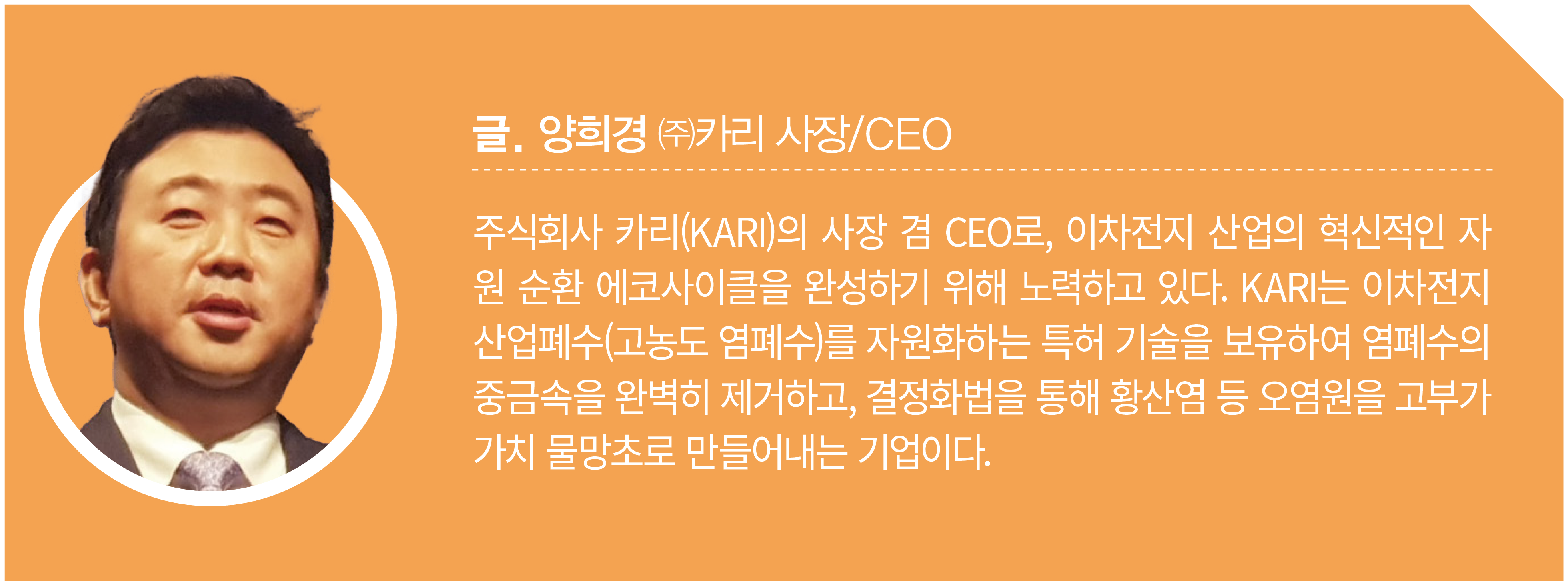 전기차의 핵심 요소인 이차전지는 양극재의 소재에 따라 원가와 성능이 크게 좌우된다. 양극재 제조에 필수적인 전구체는 엄청난 양의 물과 화학물질을 사용해 만들어지는데, 이 과정에서 대량의 폐수가 발생한다. 전구체 1톤을 생산하고 나면 약 50톤의 폐수가 발생하며, 이 폐수에는 심각한 생태독성 유발 물질인 니켈, 망간, 코발트 등의 중금속과 다량의 염이 포함되어 있다. 따라서 이차전지 산업폐수는 염·폐수라고 불린다.