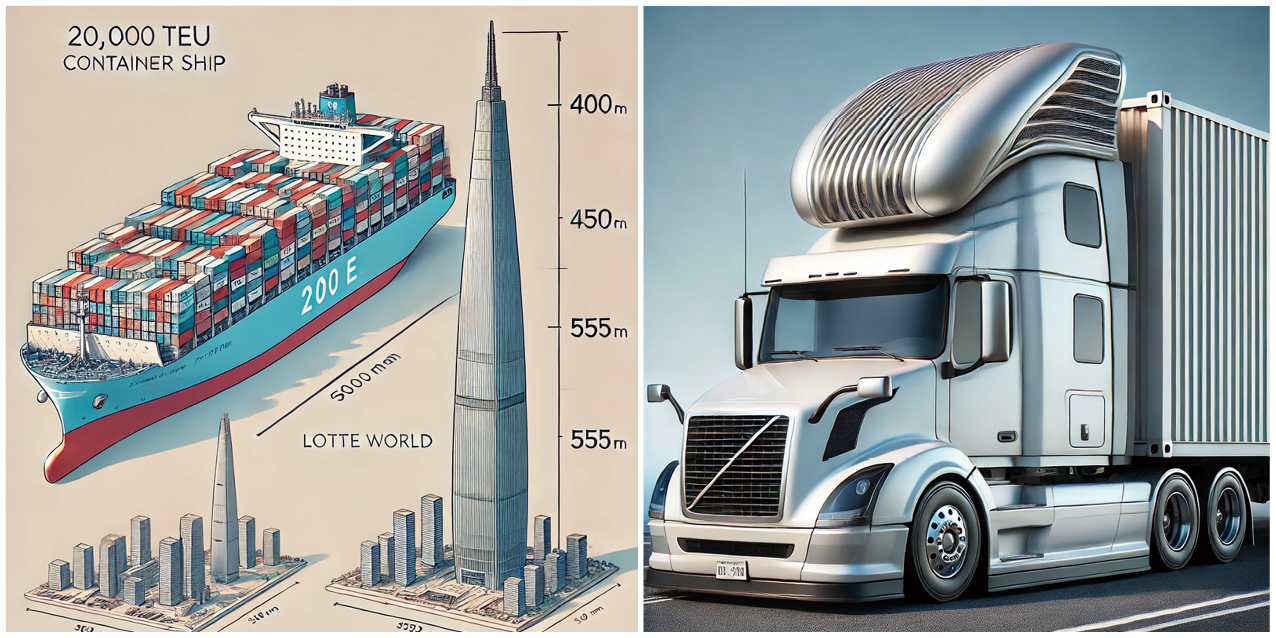 그림1 초고층 빌딩과 비교한 20,000TEU급 컨테이너선의 크기(좌) 및 컨테이너 트럭의 공기저항을 줄이기 위한 에어 페어링(우)