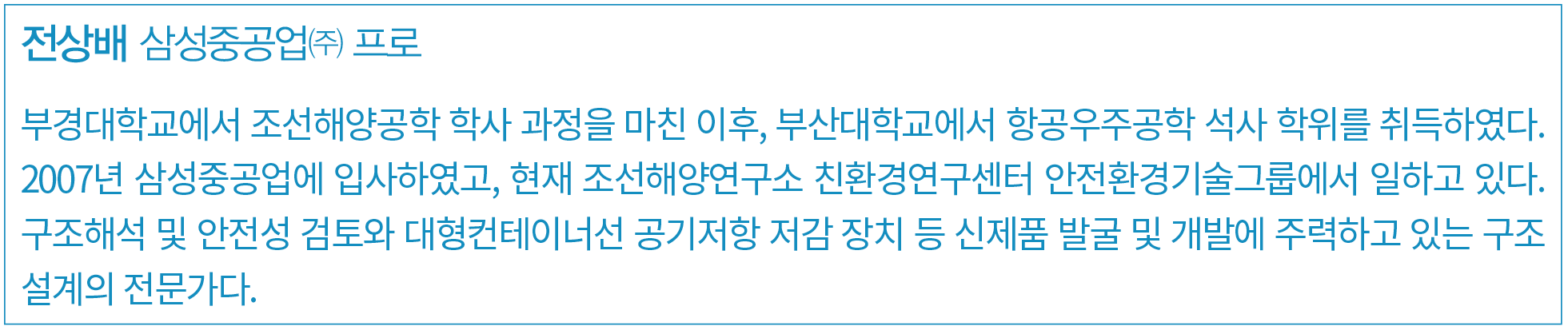 삼성중공업 친환경연구센터에서 개발한 대형 컨테이너선 공기저항 저감 장치 SAVER Wind(C)는 쉽게 말해 배에 설치하는 에어 페어링이다. 20,000TEU1)급 컨테이너선은 길이 20피트(6.1m)의 컨테이너를 2만 개 적재할 수 있는 규모다. 이렇게 컨테이너를 쌓아 올려 만들어진 거대한 벽은 배의 항해 중 공기저항의 원인이 되어 연비를 떨어트리며, 악천후 속에서는 거대한 파도가 부딪치는 타깃이 되기도 한다.