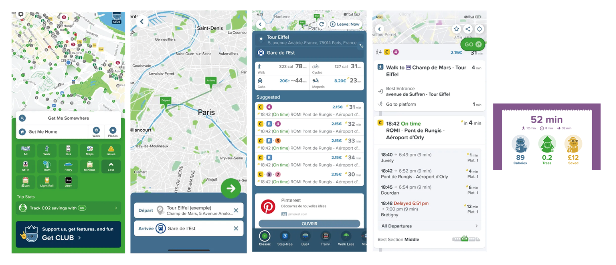그림1 Citymapper 애플리케이션의 주요 인터페이스 4종 및 사용자에게 환경 기여 사항을 직관적으로 제시하는 페이지(최우측)