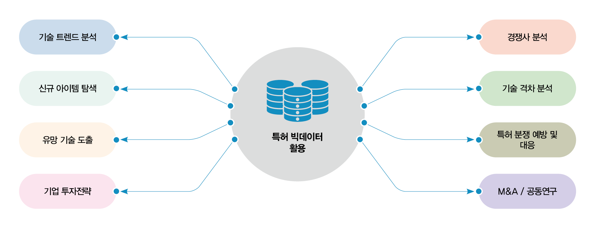 특허 빅데이터는 다양한 산업 분야의 혁신과 기술 동향을 파악할 수 있는 중요한 자원이다. 특허 빅데이터를 활용하는 방법은 다양한데, 우선 특허 데이터를 기반으로 기술 분야별/출원 연도별 분석을 통해 기술 트렌드를 분석할 수 있다. 경쟁사의 출원 동향을 분석하여 경쟁사 분석에 활용할 수 있으며, 경쟁사와의 기술 격차도 분석할 수 있다. 또한 경쟁사의 특허 데이터를 분석함으로써 특허 분쟁이 발생할 가능성을 사전에 파악하고, 분쟁 가능성이 높은 특허에 대한 대응 방안을 마련할 수 있다. 그 밖에도 기업‧대학교‧연구소 등의 특허출원 데이터를 기초로 기술력 및 기술 집중 현황 등을 분석할 수 있다. 분석 결과는 M&A 또는 공동연구(기술이전 포함)의 자료로 활용할 수 있다. 마지막으로, 특허 빅데이터를 활용하여 유망 기술 분야를 도출하거나 신규 R&D 과제를 기획하고, 신규 사업 아이템을 탐색할 수 있다.