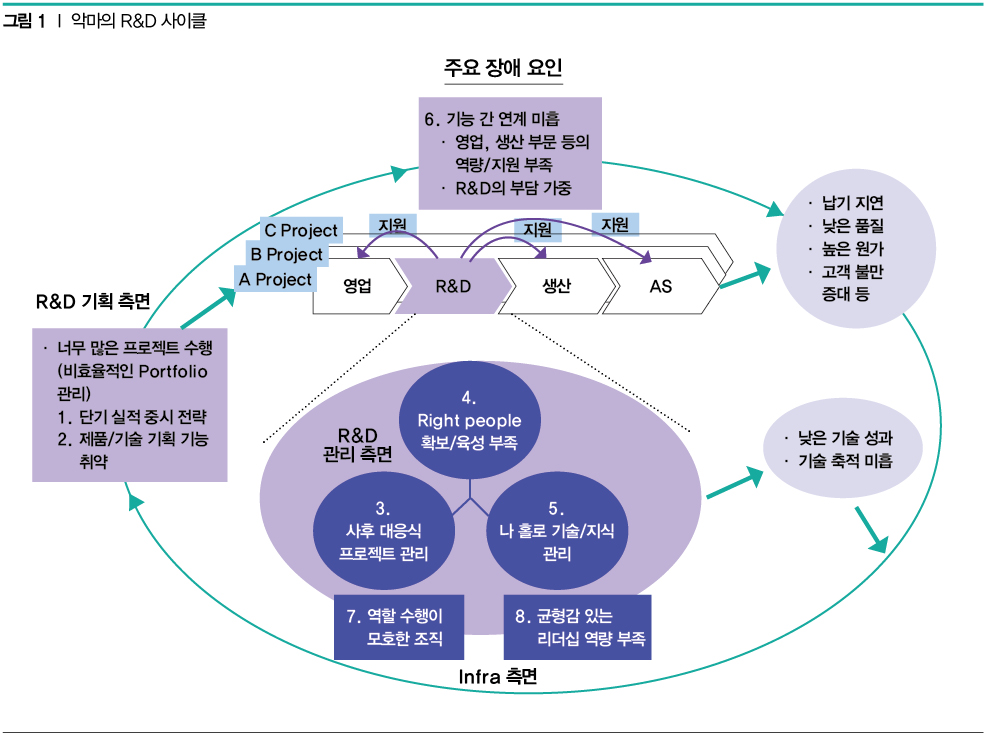 R&D가 순탄하게 성공으로 끝나기를 기대하는 것은 그야말로 희망에 불과하다. 이때 R&D 위험관리는 무조건 위험을 회피(Avoidance)하는 것이 아니라 위험과 수익간의 상관관계를 이해하고, 이를 효과적으로 관리(Management)하는 것이 중요하다. 오히려 R&D 수행과정에서 관리 요소들이 제대로 통제되지 못하면 위험 요소로 작용할 가능성은 농후하다. 이들의 상호 부정적인 영향이 순환되어 결국 프로젝트 수행을 저해하게 되는데, 이를 도식화[그림 1]한 것을 악마의 Cycle이라고 명명한다.